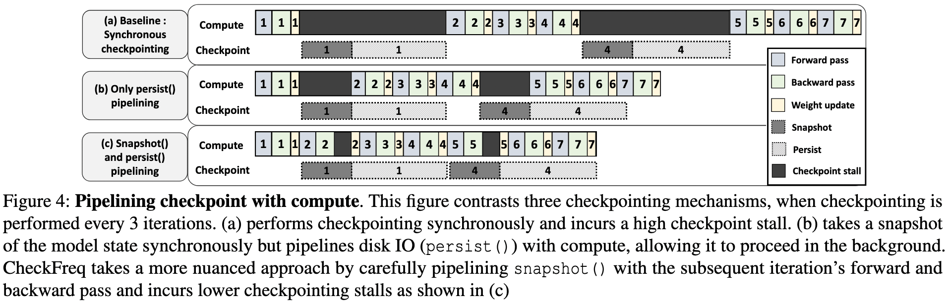 CheckPoint 的工作的 motivation 其实都有个比较大的问题,就是为什么需要如此频繁的做 CheckPoint,如果几千个/几万个 iteration 再 CheckPoint 一次的话那么 CheckPoint 的开销再大也可以忽略。这个问题我一直没想明白(也就是没找到一个合适的场景),但后来有次开会了解到阿里云内部也在做这个,他们给的场景是大规模训练时的早期出现的难以发现的错误 例如位反转,Understanding and Mitigating Hardware Failures in Deep Learning Training Systems ,会需要这种频繁 CheckPoint 来做 recover,在后期排查问题的时候可以通过 iteration 级别的 CheckPoint 来精确的定位到是哪发生问题了,这种情况下如果 CheckPoint 的对训练的时间影响能降到忽略不计,那肯定是越多 CheckPoint 越好。