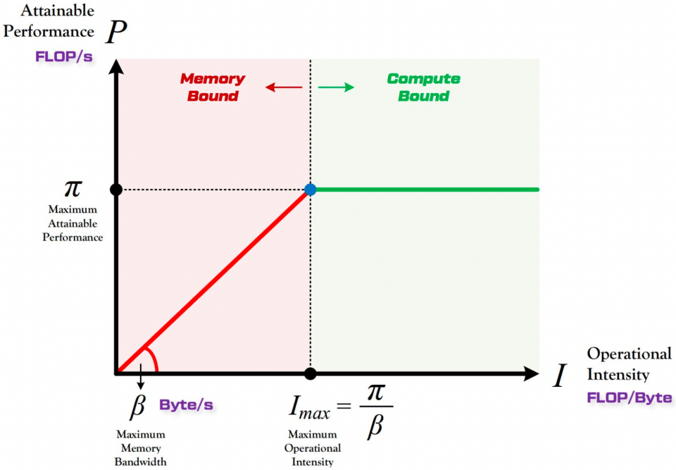 由上图中可以看到,计算能力先由带宽上限限制,在带宽满足后才会由算力限制,而带宽和算力分别决定了前段 roofline 的角度和后段 roofline 的高度。roofline 给定了平台计算能力上限,而计算任务需要根据其计算强度与访存强度来在图中找到对应的位置。