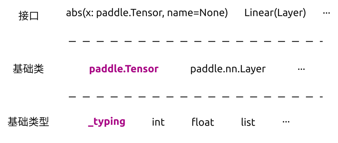 Paddle 中会用到很多公用的标注类型,比如数据布局 NCHW、NHWC 等。_typing 模块的引入,一方面可以统一规范开发者的标注行为,减少维护成本,另一方面,也可以减少各类书写错误。可以将 _typing 模块的地位与 Python 中的 int、str 等基础类型等同,由此,整个 Paddle 项目的标注体系可以分为: