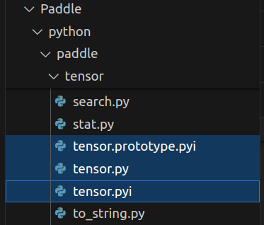 ...而有些接口,Paddle 是通过 pybind 或 patch 的方式提供,则需要增加对应的 stub 文件。最基本的,如 Tensor 类,需要提供 tensor.pyi 文件: