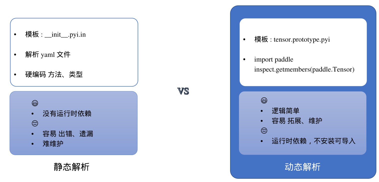 如前文所述,Paddle 很多接口是通过 pybind 或 patch 的方式对外开放的,这里最基础,也是最主要的是 Tensor 的实现。我们没有借鉴 PyTorch 等框架的做法使用「静态解析」的方式生成 tensor.pyi 文件,而是「动态解析」: