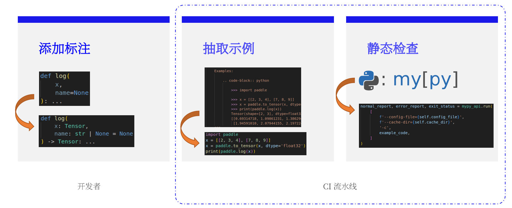 由于 Paddle 之前对接口的建设都要求书写「示例代码」,其中包括了接口基本的使用方式,那么,我们就可以通过对其进行类型检查,从而保证 Paddle 整体接口的基础类型检查的正确性了。
